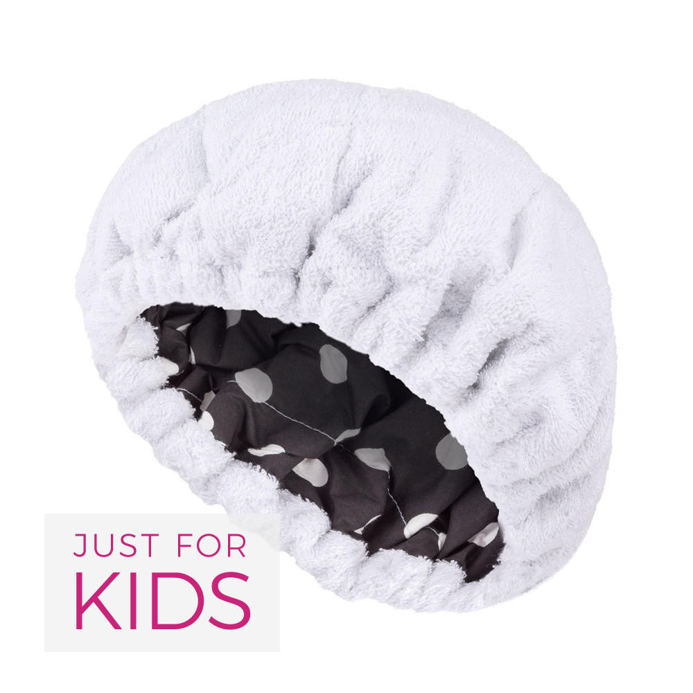 The Dottie Little Hot Head™ features a timeless black-and-white polka dot print paired with soft terry cloth, creating a chic, classic look kids love. They can wear either side depending on their mood.