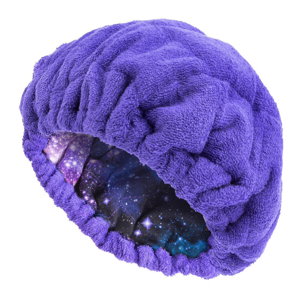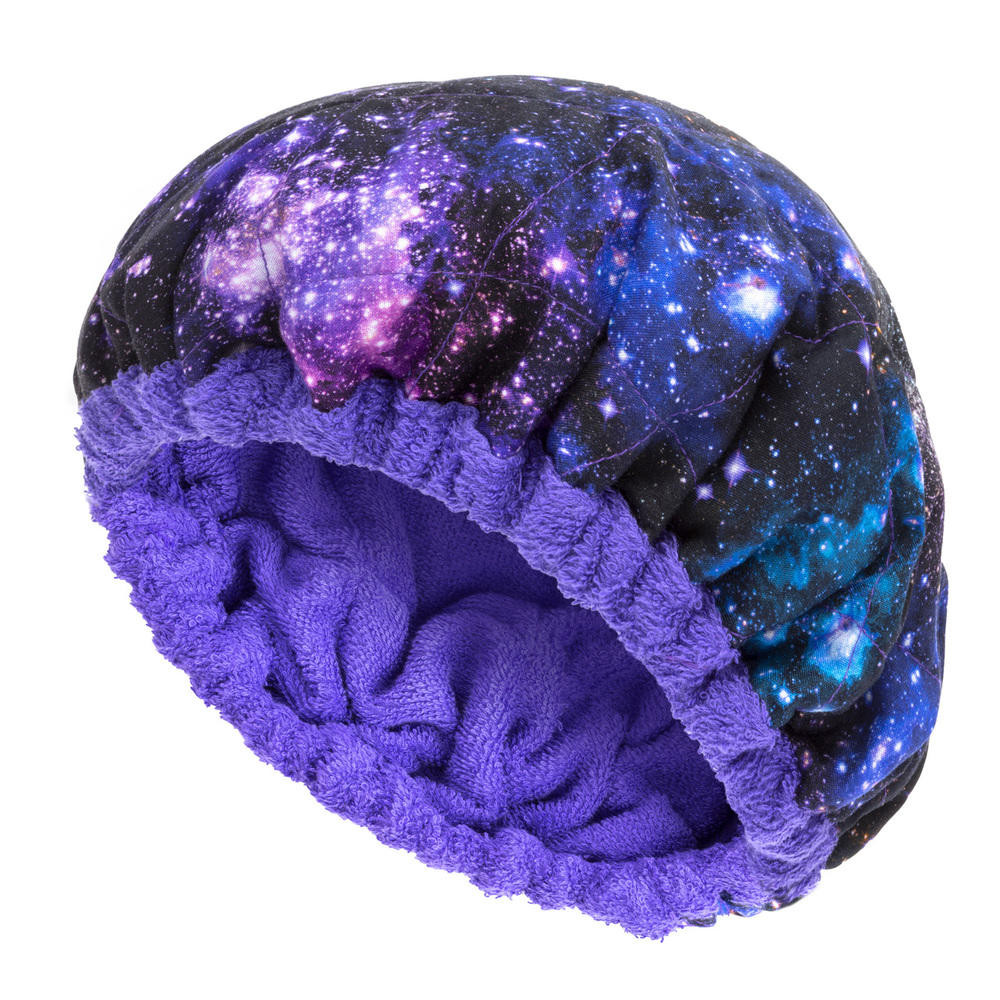 Shoot for the stars with the Stellar Hot Head! A solid purple terrycloth on one side, an out of this world reversible galaxy print on the other. Wear your favorite side facing out or alternate them depending on your mood.